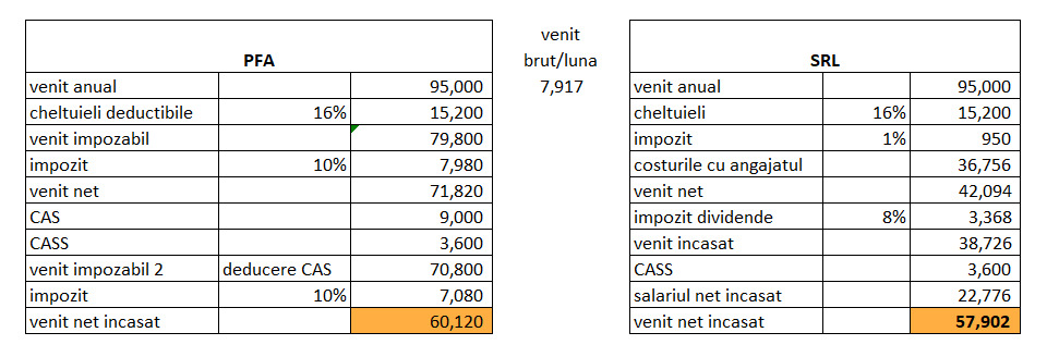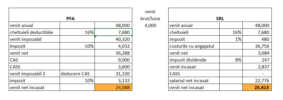 Incepand cu venituri de 4.000 lei/luna (48.000 lei/an) SRL-ul poate sa fie o alegere cu precizarea ca in intervalul 68.000-95.000 lei/an diferentele intre veniturile nete incasate sunt nesemnificative (sub 3%) intre PFA si SRL.