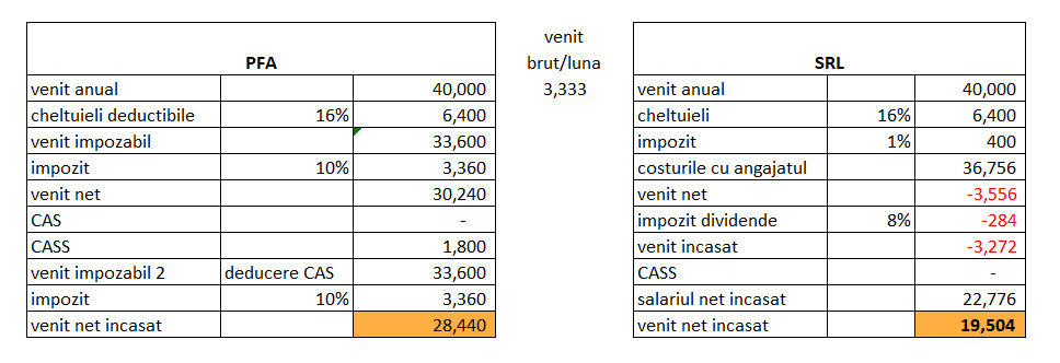 Pentru venituri lunare de pana la 3.350 lei (40.000 lei/an) este de ales PFA. Din punct de vedere al afacerii, din cauza costurilor cu angajatul, SRL-ul este neprofitabil pana la acest prag.