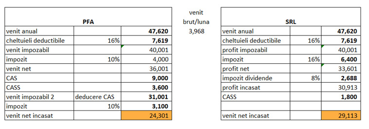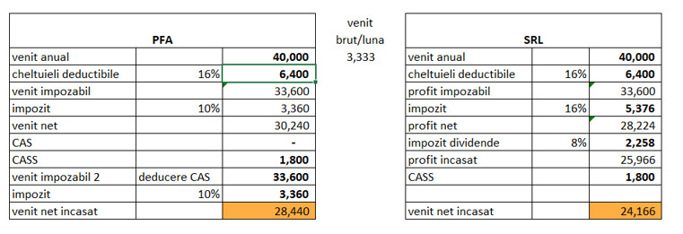 Pentru venituri lunare de pana la 3.350 lei (40.000 lei/an) este de ales PFA. Pentru venituri mai mari de 4.000 lei pe luna (47.620 lei/an) este de ales SRL.